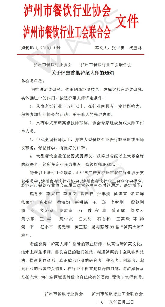 泸餐协【2018】3号文件:关于评定首批泸菜大师的通知