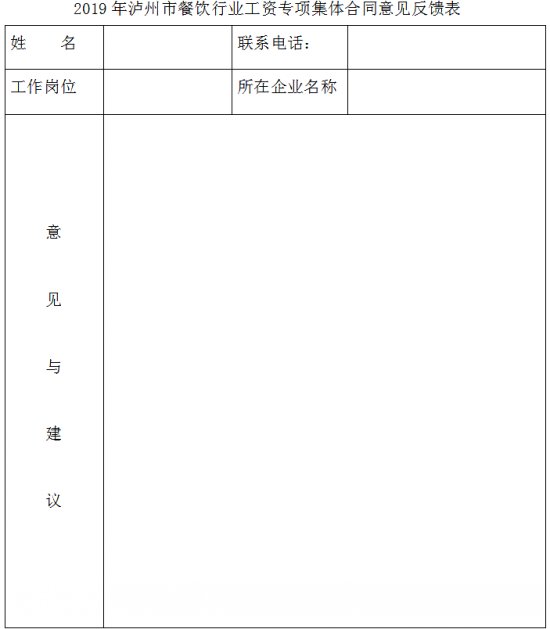 附件二:2019年泸州市餐饮行业工资专项集体合同的意见反馈表