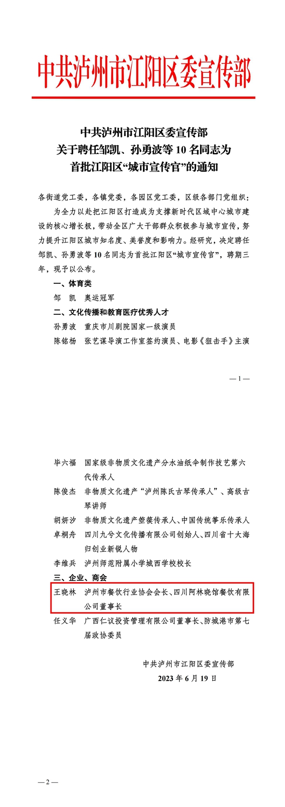 祝贺!泸州市餐饮协会会长王晓林获聘首批江阳区“城市宣传官”